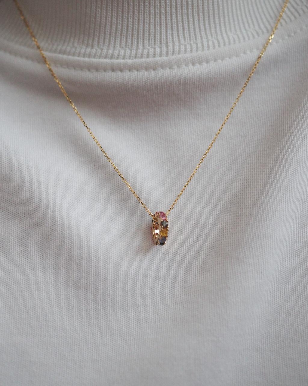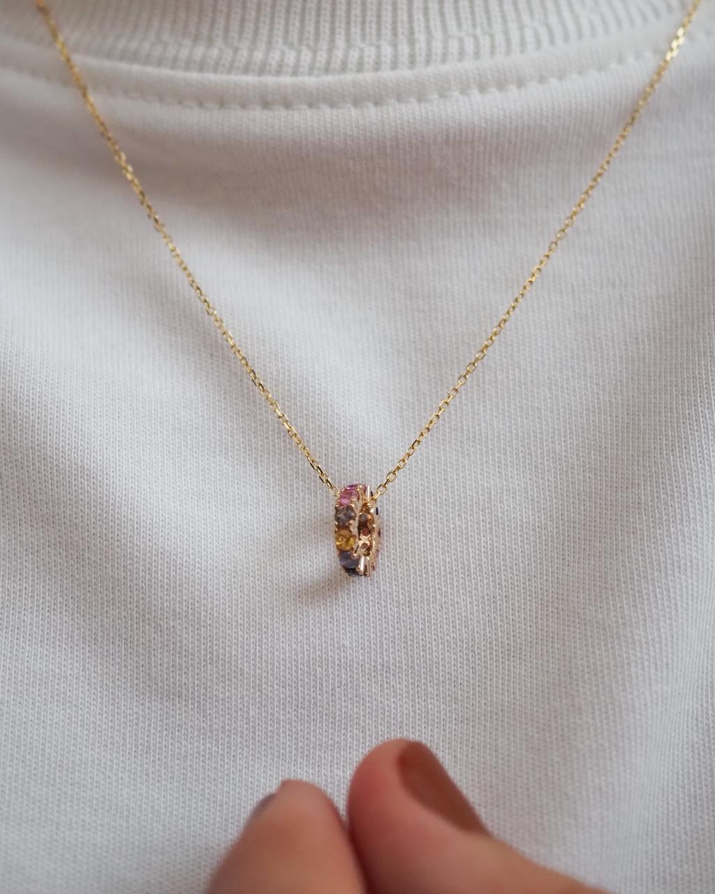 Una celebración de color, movimiento y significado. Hecho a mano en oro macizo de 10k y adornado con piedras de los tonos que tú desees. The Rondelle II es un dije que captura la alegría desde cada ángulo. Cada uno es verdaderamente único, no hay dos iguales.