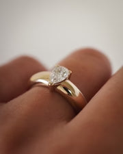 En el centro descansa un diamante en corte pera: elegante, luminoso y lleno de significado. Su silueta en forma de lágrima simboliza a la vez vulnerabilidad y devoción. Montado sobre una cálida banda de oro, el diseño se siente natural y atemporal, como si siempre hubiera estado destinado a acompañarte.