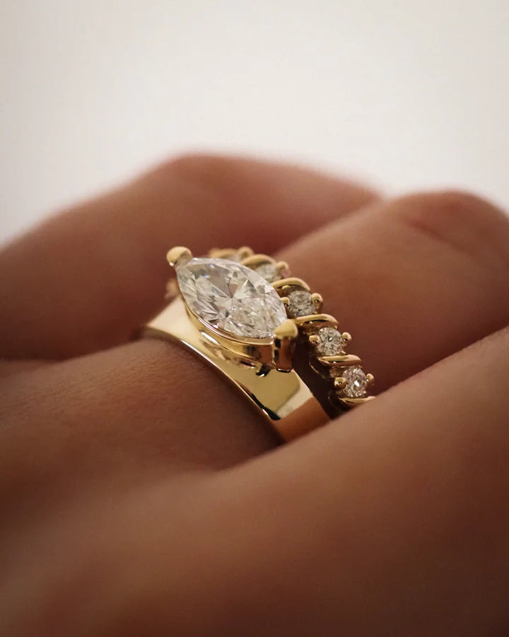 Pensado para usarse todos los días, el aro tiene una presencia sólida pero cómoda, logrando un equilibrio entre fuerza y elegancia. Su perfil bajo lo hace fácil de llevar y profundamente moderno, mientras que el corte marquise aporta un sutil guiño al romance vintage.